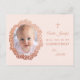A floral godmother proposal recommended for a girl. The placeholder oval photo of a baby is inside a rose gold floral wreath, on the left side. On the right side, with a rose gold cross above it, there is the text, in a similar color. The names and the signature are written in script, the rest in smaller caps. The background is blush pink. There is also a message on the back, in the same pink script.