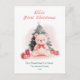 The cutest little teddy bear is pink, waiting under the Yuletide tree, and surrounded by gifts for Christmas. This is a baby's first Christmas card. It is from a nice vintage watercolor. All of the text can be changed. Be sure to edit the family names and date.