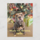 The words on this postcard say, "What's the password, Santa?" This funny Christmas postcard shows our handsome Blue Nose Pitbull named Sarge with an adorable look on his face as he guards the Christmas tree and presents...even from Santa.