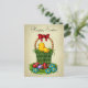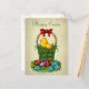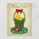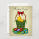 Pollo dulce con huevos de pascua, canasta y flores azules sobre hierba y fondo beige vintage. Obra de arte ACEO original hecha con marcadores de Koh-I-Noor Rapidograph (lineart) y Letraset Tria (coloreado) en papel Bristol.