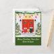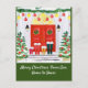 La acuarela festiva ilustrada escena del invierno incluye la puerta principal de casa decorada con árboles, coronas, ornamentos, garland y más, además de cuatro pares de botas de invierno llenas de nieve en la puerta. Personalice el texto "Feliz Navidad desde nuestro hogar a nuestro hogar" con un guión moderno y blanco sobre fondo verde festivo.