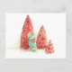 Un ciervo acuático vintage se para en la nieve frente a los abruptos árboles de Navidad con botellas rosas.