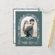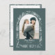 This unique design features a trendy arch-shaped photo template with a white line drawn winter botanical border on a sage green background.