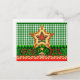 Una postal folclórica y decorativa de DIOS JUL al estilo de los Navidades escandinavos. Ilustrado por Anni Arts al estilo de las pinturas folclóricas tradicionales escandinavas. Estrella folk, trenzas, gingham y lindo cuerno de reno en colores tradicionales.