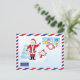 Postal de navidades sin texto - puedes escribir con un bolígrafo o puedes escoger un tipo de letra y personalizarlo ahora mismo - que incluye un sobre cuadrado con bordes azul oscuro y rojo. Tiene un ilustracion de Santa Claus en la nieve ondeando cerca de un árbol blanco y un muñeco de nieve. Hay una pequeña etiqueta azul que dice "AIR MAIL PAR AVION" porque todo el correo del Polo Norte es una prioridad. ¡Debe llegar a tiempo para los Navidades! Este sobre de Express Mail tiene dos estampillas de colores: en una hay un globo de nieve y regalos de Navidad, en la otra hay una corona de Navidades con un arco amarillo y campanas rojas. A Santa le gusta usar el correo caracol. ¡Es un tipo anticuado!