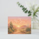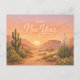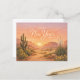 This warm and tranquil New Year design features a peaceful desert landscape at sunrise. Golden light rises over distant mesas and canyon cliffs, casting a soft glow across sandy paths and desert blooms. Tall saguaro cacti, round barrel cactus, yucca plants, and clusters of wildflowers frame the foreground in earthy tones of terracotta, sage, and warm amber. The pastel sky blends peach, coral, and soft lavender hues, creating a calm and hopeful atmosphere. Elegant script lettering floats above the horizon, complementing the serene Southwestern setting and symbolizing a fresh beginning inspired by nature’s quiet beauty.