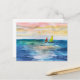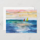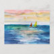 Una pintada acuática de dos veleros coloridos sobre un mar tranquilo al atardecer. Los tonos cálidos del cielo contrastan con el agua azul profundo de esta escena náutica pintada a mano.