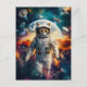 A tabby cat flying wearing a white suit with gray accents. Earth and stars shine in the background, highlighting the feline space explorer.