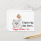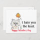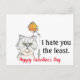 Gato gruñón divertido con gráfico de pájaro y pez colgante. Texto "Te odio menos" y "Feliz día de San Valentín".