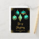 Send warm holiday wishes with this sophisticated Christmas postcard featuring five elegant ornaments in teal blue and gold tones. Each ornament showcases a unique design - floral, snowflake, dripping faux glitter, diamond pattern, and stars - against a rich black background with golden sparkles. The luxurious palette and refined layout make this card ideal for stylish families, formal greetings, or corporate holiday messages. Perfect for those who love modern elegance with a festive twist.