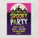 A bold and vibrant Halloween postcard perfect for a spooky party invitation. This vertical design features three glowing jack-o'-lanterns silhouetted under a huge full moon against a dramatic pink and purple sky with flying bats. The large text "SPOOKY PARTY" and clear event details, including "OCT 31" and "8:00 PM" at "THE GHOST HOUSE", make this an unforgettable Halloween event announcement. Use this colorful and exciting card to invite guests, if they dare.
