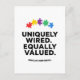 This bold awareness design delivers a powerful message of inclusion and neurodiversity through clean typography and symbolic puzzle elements. The phrase “Uniquely Wired. Equally Valued.” highlights individuality while affirming equal worth and respect for all minds. Colorful puzzle imagery reinforces connection, diversity, and acceptance, creating a visually striking and emotionally resonant design that supports understanding, empowerment, and inclusive values.
