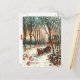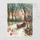Vintage ilustracion navideño de un trineo tirado por caballos con una pareja en él. Es una hermosa noche de invierno, con los altos árboles cubiertos de nieve y el camino en el bosque.