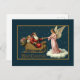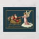 Vintage Christmas card featuring a classic illustration of Santa Claus riding in a richly decorated golden sleigh full of gifts. Santa, with a long white beard and a red suit, is accompanied by two small children with halos, tucked among the presents in the back of the sleigh. The scene takes place against a dark blue, starry night sky. The most striking element is a beautiful, light-haired angel with large white wings and a halo, dressed in a long pink gown, standing on a fluffy white cloud and gently taking Santa's hand. The entire illustration is framed by a golden border and set on a dark teal or navy background, with the words "MERRY CHRISTMAS" in decorative gold lettering at the bottom.