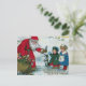Imagen clásica del vintage del navidad de Papá Noel con un saco enorme de juguetes que dan los regalos a dos pequeños niños mientras que un pequeño perro mira encendido. La escena entera se fija en un paisaje nevoso. El mensaje de la tarjeta es "las Felices Navidad".