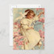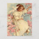 Una imagen victoriana de una jovencita adorable de color rosa sentada en un árbol rodeada de flores de color rosa bonito y palomas blancas.