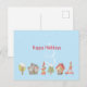 La fascinante escena de las "calles" de invierno de acuarela incluye cabañas, árboles cubiertos de nieve y un auto con regalos apilados en lo alto. Todo sobre un fondo azul claro con una mágica espiral de nieve. Personalizable texto "Felices Fiestas" en letra moderna
