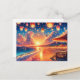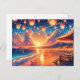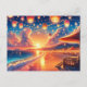 Una puesta de sol vibrante pinta el cielo con tonos de naranja, rosa y azul, reflejándose brillantemente en la superficie del océano. Linternas brillantemente iluminadas están suspendidas en el aire, creando una atmósfera festiva a lo largo de una playa serena. La costa está adornada con luces de cuerda, proyectando un resplandor cálido sobre la arena. Varias sillas y mesas de playa están dispuestas bajo grandes parasoles tradicionales, sugiriendo un espacio para la relajación y el disfrute. Montañas majestuosas se elevan en el fondo, silueteadas contra el cielo colorido, mientras que nubes esponjosas flotan encima, añadiendo a la escena pintoresca y tranquila.
