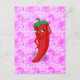 Un personaje de dibujos animados de pimiento rojo y picante. Diseño original con patrón de encaje rosa en el fondo.