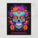 La postal cuenta con una obra de arte llamativamente vibrante e intrincada. Con un fondo negro dramático, un cráneo azucarero intenso ocupa el centro del escenario, con su diseño detallado que capta la vista con una mezcla fascinante de patrones y formas. Flores radiantes naranjas, violetas y animadas rosadas adornan los bordes de la postal, sus pétalos y hojas girando en un elegante baile alrededor del cráneo. Cada flor rebosa con su propio matiz único, creando una exposición de colores animada y armoniosa. Debajo de esta fascinante obra de arte, hay un área de texto de personalizable. Esto permite la personalización, permitiendo al remitente añadir su propio mensaje, ya sea un saludo cálido, una nota reflexiva o cualquier sentimiento que quiera transmitir. El área de texto está diseñada para complementar la vibrante obra de arte, proporcionando un equilibrio perfecto entre creatividad y toque personal. En general, esta postal es una obra maestra visual, una fusión de colores vivos, detalles complejos y elementos de personalizable que la convierten en un lienzo perfecto para compartir deseos cálidos y sentimientos personales.