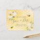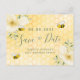 Una tarjeta Save the Date para una fiesta de cumpleaños del 50 de verano. Fondo amarillo y blanco con un patrón de peine de miel. Decorado con flores tropicales de color amarillo claro, color crema, hibiscos y abejas con burbujas alegres. Plantillas para una fecha y nombre/edad 50. Letras verdes de color gris. El texto: Save the Date se escribe con un gran guión de estilo escrito a mano. Sugerencia: Si no desea que se vea como una postal, haga clic en personalizar, vaya a la parte posterior y quite el separador y el sello postal.