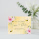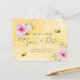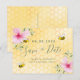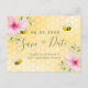Una tarjeta Save the Date para una fiesta de cumpleaños de verano de 50 años (o de cualquier edad). Fondo amarillo y blanco con un patrón de peine de miel. Decorada con flores tropicales de color rosa, hibiscos y abejas felices con burbujas. Plantillas para una fecha y nombre/edad 50. Letras verdes de color gris. El texto: Save the Date se escribe con un gran guión de estilo escrito a mano. Sugerencia: Si no desea que se vea como una postal, haga clic en personalizar, vaya a la parte posterior y quite el separador y el sello postal.