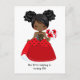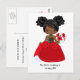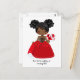 Invitación de cumpleaños con una pequeña princesa negra con vestido de mariquita y tipografía adorable de mariquita en el reverso.