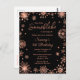 Esta elegante y glamurosa tarjeta postal de invitación cuenta con copos de nieve de purpurina falsa rosa oro pintados a la acuarela y destellos en un fondo negro. Es perfecta para una fiesta de cumpleaños con tema de invierno o Navidad.