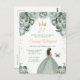 Esta elegante y glamurosa invitación de cumpleaños presenta a una hermosa princesa con cabello castaño en un vestido de baile verde salvia. El texto combina la escritura a mano y las fuentes modernas sans serif para un aspecto clásico y sofisticado. Los arreglos florales, la mariposa y el confeti dorado crean la combinación perfecta de rústico y chic.