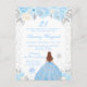Esta elegante y glamurosa invitación de cumpleaños de invierno presenta a una hermosa princesa con cabello castaño rojizo y piel clara con un vestido de gala azul. El texto combina letra manuscrita y fuentes modernas sans serif para un aspecto clásico y sofisticado. Los arreglos florales, copos de nieve y confeti plateado crean la mezcla perfecta de rústico y chic.