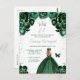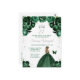Esta elegante y glamurosa invitación de cumpleaños presenta a una hermosa princesa con cabello rubio en un vestido de gala verde oscuro. El texto combina letra manuscrita y fuentes modernas sans serif para un look clásico y sofisticado. Los arreglos florales, la mariposa y el confeti plateado crean la combinación perfecta de rústico y chic.