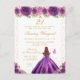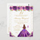 Esta elegante y glamurosa invitación de cumpleaños presenta a una hermosa princesa con cabello castaño rojizo y piel clara con un vestido de baile de color púrpura oscuro. El texto combina letra manuscrita y fuentes modernas sans serif para un aspecto clásico y sofisticado. Los arreglos florales, las mariposas y el confeti dorado crean la combinación perfecta de rústico y chic.