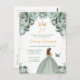 Esta elegante y glamurosa invitación de cumpleaños presenta a una hermosa princesa con cabello castaño en un vestido de baile verde salvia. El texto combina letra manuscrita y fuentes modernas sans serif para un aspecto clásico y sofisticado. Los arreglos florales, la mariposa y el confeti dorado crean la mezcla perfecta de rústico y chic.