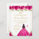 Esta elegante y glamurosa invitación de cumpleaños presenta a una hermosa princesa con cabello oscuro y piel oscura en un vestido de baile rosa intenso. El texto combina letra manuscrita y fuentes modernas sans serif para un look clásico y sofisticado. Las disposiciones florales, las mariposas y el confeti dorado crean la mezcla perfecta de rústico y chic.