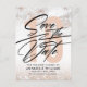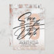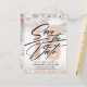 Tarjeta postal de cumpleaños Sweet 16 moderna y trendy. El diseño presenta el número 16 en rosa dorado sobre un fondo de mármol y brillo en rosa dorado, tipografía script ''save the date'' y detalles en letras negritas.
