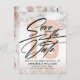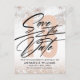 Tarjeta postal moderna y trendy de cumpleaños número 18 Save The Date. El diseño cuenta con el número 18 en rose gold sobre un fondo de mármol rose gold con brillo, tipografía script ''save the date'' y detalles en letras negritas.