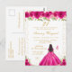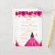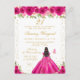 Esta elegante y glamurosa invitación de cumpleaños presenta a una hermosa princesa con cabello oscuro y piel oscura en un vestido de baile rosa brillante. El texto combina letra manuscrita y fuentes modernas sans serif para un look clásico y sofisticado. Los arreglos florales, las mariposas y el confeti dorado crean la combinación perfecta de rústico y chic.