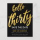 Diseño de tarjeta postal de "Guardar la fecha" para fiesta de cumpleaños 30 años elegante con tipografía grande en dorado y texto personalizado.