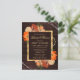 Precioso diseño floral de flores otoñales de acuarela rústica naranja quemado en un fondo de madera marrón con borde de lámina dorada y luces de cuerda