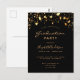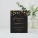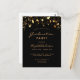 Una glamorosa tarjeta de invitación para una fiesta de graduación de 2023 para él y ella. Un fondo negro decorado con estrellas de oro falsas. Personalice y agregue un nombre y detalles del fiesta. El texto Graduación y el nombre están escritos con escritura de estilo con letras a mano moderna. Texto dorado. Atrás: diseño de postal