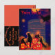 Tarjeta postal de fiesta de Halloween con calabazas naranjas brillantes, pájaros negros, cuervos, gato negro y luna llena en un cementerio con lápida. Pájaros negros volando alrededor en el cielo oscuro de la noche de Halloween. Niebla naranja alrededor de la lápida y los personajes. Rellene la información de su fiesta en la lápida. Cielo nocturno azul oscuro y fondo negro. Mucho negro y naranja. Arte de Patricia Villa.