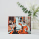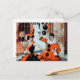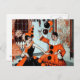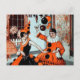 Vintage ilustracion de la fiesta de Halloween en naranja y negro con mujer disfrazada de bruja y un hombre vestido de payaso