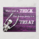 Esto no es un truco, nuestro fiesta de la casa es un regalo. Una tierna invitación de postales para fiestas de limpieza de Halloween o cambio de tarjeta de dirección para una familia que se ha mudado en el mes de octubre. Un gracioso esqueleto en una espeluznante pared morada para dar la bienvenida a la gente a tu nuevo hogar para una divertida reunión.