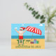 Esta linda tarjeta postal de Navidad en julio hace una invitación perfecta para una fiesta de verano en la playa o reunión en la piscina. Haz que sea una extravagancia divertida con tema del polo norte con Santa Claus en su traje de baño junto a una sombrilla de playa a rayas rojas y blancas y regalos. ¡Nunca he visto al Sr. Klaus en traje de baño antes! El texto verde une el divertido tema de Navidad.