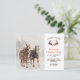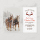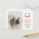 Una postal de un fiesta Navidad con una fotografía al aire libre que muestra a un equipo de dos caballos de compañía belgas jalando un trineo. Copos de nieve cayendo suavemente con pinos cubiertos de nieve en el fondo. Un ilustracion de 2 ciervos saltantes con colorido rojo sobre tu texto de invitación personalizado.