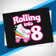 Este diseño de fiesta de patinaje es perfecto para una fiesta de patinaje sobre ruedas o tema de cumpleaños para un niño de 8 años. Si la cumpleañera o el cumpleañero ama patinar, ¡les ENCANTARÁ este diseño de fiesta de patinaje! Características del estilo retro "Rodando hacia 8" cita de cumpleaños con gráfico genial de patines con arcoíris y estrellas que es divertido y único. ¡Diseño divertido de fiesta de patinaje para un 8º cumpleaños!