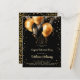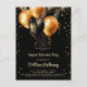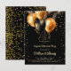 Una moderna invitación festiva sorpresa para una fiesta de retiro con globos dorados y negros con purpurina de oro y una tipografía de escritura caligráfica.