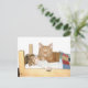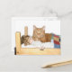 Naranja tabby cat en la cama con una muñeca mirando como si te atrevas a comentar sobre la foto postal