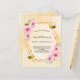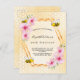Elegante, divertido, verano 50 (o cualquier edad) invitación de fiesta de cumpleaños. Fondo amarillo y blanco con un patrón de peine de miel. Con un marco geométrico de oro falso. Decorada con flores tropicales rosas, hibiscos y abejas felices con burbujas. El nombre está escrito con una escritura de estilo con letras a mano moderna. Cartas negras. Perfecto para un fiesta de té de verano en un jardín, patio trasero. Espalda: patrón de abeja blanca amarilla y abeja feliz. Sugerencia: Si no desea que se vea como una postal, haga clic en personalizar, vaya a la parte posterior y quite el separador y el sello postal.