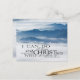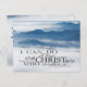 La postal cristiana de las escrituras inspiradoras muestra una fotografía de la naturaleza con montañas azules cubiertas con una nube nublada. Presenta la Biblia contra los filipinos 4:13, "Puedo hacer todas las cosas a través de Cristo que me fortalece". El saludo puede ser personalizado o borrado para una nota escrita a mano.